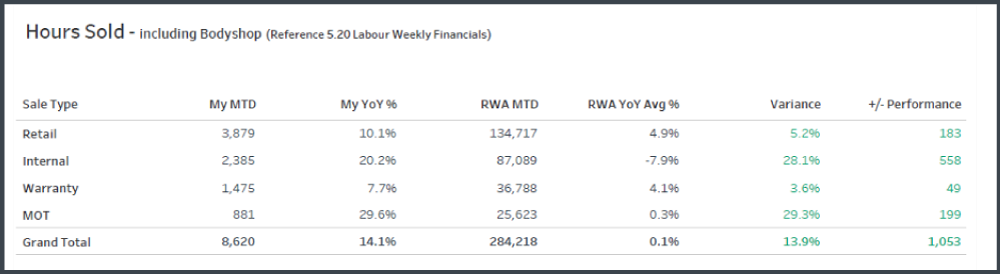 Our weekly flash report shows each of our customers how they are doing against other RWA Automotive customers on a month to date basis. It includes categories such as orders, new and used car sales, hours sold and parts sales. This shows whether the dealership group is trading up or down year on year against the RWA Automotive market cohort. This provides a weekly temperature check of the market enabling the dealer group to either push harder or appreciate the performance achieved.