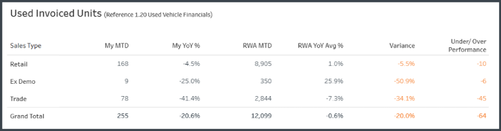 Here, we see a retailer who is struggling on used cars. We can quickly see they are down YOY on their own performance but also on the RWA Automotive average year performance. This tells them that the market is performing well, but their group is falling behind. We can also see how many vehicle sales below the average they are. In this case, they would need to make up an additional 64 units to catch up to the RWA Automotive average. Without adapting or making a change, this retailer is unlikely to achieve their target at the end of the month, thus falling behind budget.